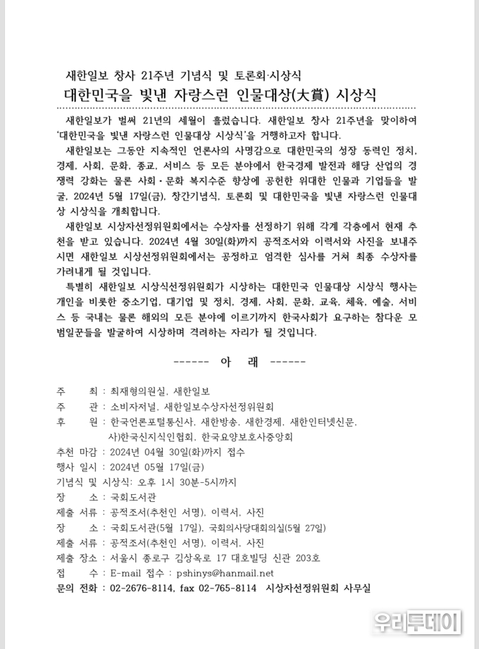 우리투데이 이동현 기자 | 새한일보(회장 신유술)는 창사 21주년을 맞아 5월 17일 국회도서관에서 '대한민국을 빛낸 자랑스런 인물대상 시상식'을 개최한다고 밝혔다.