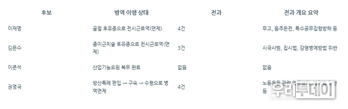 우리투데이 이승일 기자 | 대한민국 21대 대통령선거에 출마한 TV토론 4명중에 더불어민주당 이재명 후보와 국민의힘 김문수 후보는 전시근로역(5급, 면제)로 군대를 가지도 않았고, 개혁신당 이준석 후보는 산업기능요원 복무 완료(대체복무), 민주노동당 권영국 후보는 최종 면제(수형으로 인한 소집면제)를 한 사실이 밝혀져 충격을 주고 있다.