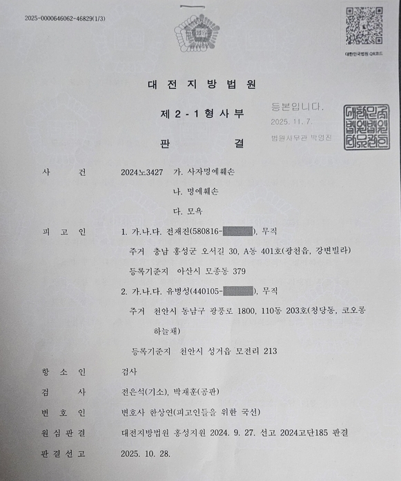 우리투데이 이동현 기자 | 대전지방법원 제2-1형사부(항소) 사건번호 : 2024노3427 사자명예훼손 명예훼손 모욕과 관련한 항소심에서 검사의 항소가 기각되어 확정판결로 결국 피고인 전재진 작가는 1심에 이어 2심에서도 무죄로 판결이 11월 5일자로 확정되어 앞으로 김을동 전 국회의원을 상대로 무고죄로 고소할지가 주목받고 있다.