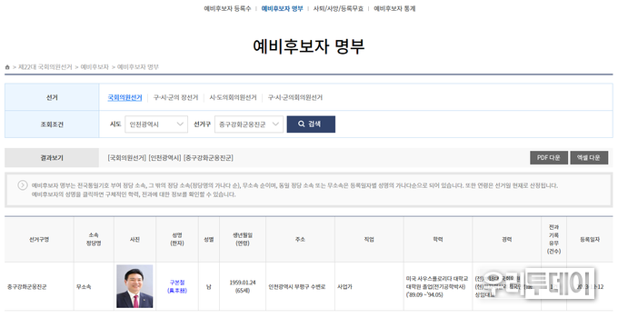 우리투데이 이승일 기자 | 인천광역시 중구강화군옹진군 지역구에 12월 12일 무소속 구본철 후보가 예비후보자로 등록해 화제가 되고 있다.
