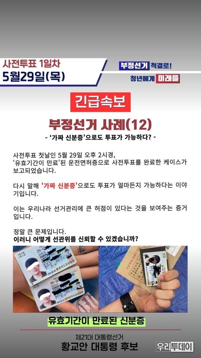저와 제 캠프에는 오늘 하루 동안 전국 각지에서 투표 현장을 지키고 있는 정당 참관인들, 자발적인 시민 감시단 여러분의 제보가 쏟아지고 있습니다. 이 내용들은 단순한 실수나 착오의 수준을 넘어, 의도적 조작과 시스템적 부실의 정황을 강하게 드러내고 있습니다.