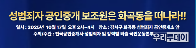 우리투데이 이동현 기자 | 전국공인중개사 성범죄자 및 강력범 퇴출 국민운동본부(회장 김영모)는 10월 17일 오후 2시~4시에 화곡동 성범죄자 공인중개사 사무소 앞에서 집회신고를 내고 정식으로 집회 및 기자회견을 진행한다고 밝혔다.