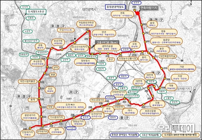 우리투데이 이동현 기자 | 대전광역시(시장 이장우)는 10월 27일 보도자료를 통해 2028년 12월 개통 목표인 도시철도 2호선 45개 트램 정거장 이름을 확정했다고 밝혔다.