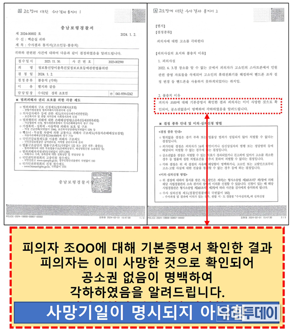 A. 네! 수사결과통지서를 살펴보니 피의자 조OO씨가 이미 사망하였다고 명시되어 있습니다. 조한연과 이장과 보령시청 공무원과 보령경찰서 공무원이 한 무리가 되어 위장 사망자로 은폐하고 있어요. 마을 주민 중에는 이장의 말을 따르지 않는 정직한 주민은 사망했다는 말을 들어본 적이 없다고 했어요. 보령경찰서에서 수사결과통지서를 보내주지 않아 제가 방문하여 받은 통지서에 《이미 사망하였음이 확인되어》라고 명기한 것은 의도적입니다.