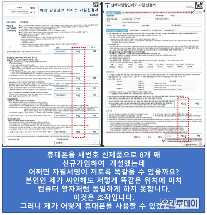 A. 의혹이 아니라 실제입니다. 환경설정변경, 7개 째 휴대폰에서도 통화 도청, 메시지 차단, 음성녹음 삭제•편집, 통화 차단, 도용 등등이 원격접속으로 조종되고 있습니다. 휴대폰 신규가입신청서를 살펴보면 제가 싸인한 부분에서 조작임이 발견됩니다. 제가 직접 싸인해도 저토록 똑같은 위치에 똑같은 필체로 쓰지 못할 것입니다. 이처럼 제 휴대폰은 누군가에 의해 SKT 대리점에서부터 조작되고 있는 것입니다.
