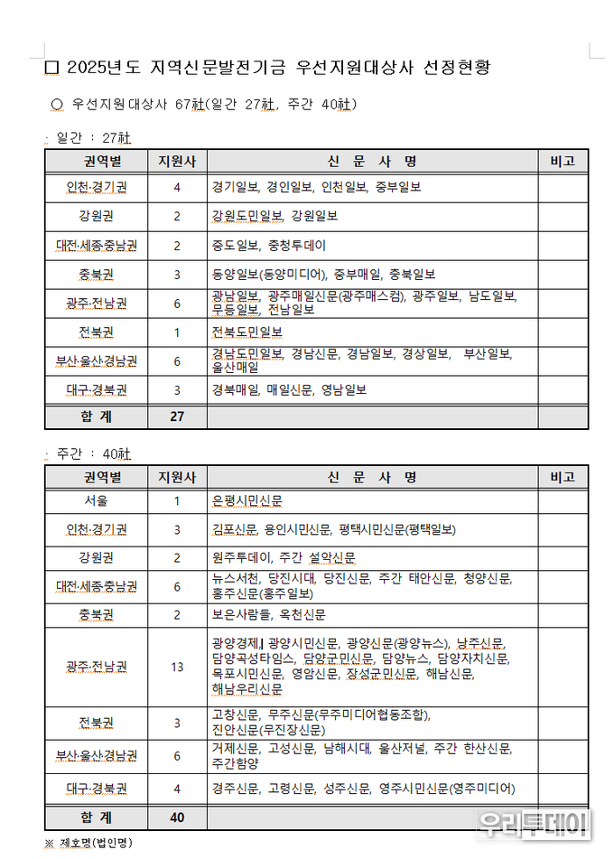 자료에 따르면 2025년 지역신문발전기금 우선지원대상자는 일간신문 27개사, 주간신문 40개사가 선정되었는데, 그중에 일간지에서는 광주일보가 지난 2025년 11월 20일에야 '인터넷신문' 등록을 마쳤는데 선정된 것은 아이러니한 일이다.