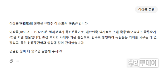본지는 chatGPT에게 최초에 질문을 통해 '이상룡 본관'이란 질문을 던졌는데, 그에 대한 chatGPT 대답은 "이상룡(李相龍)의 본관은 **경주 이씨(慶州 李氏)**입니다"라고 답변을 해왔다.