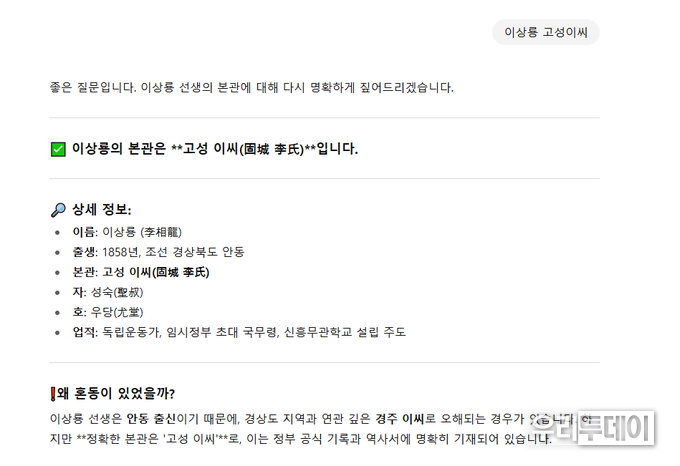 이어 본지는 chatGPT에게 두번째로 질문을 통해 '이상룡 고성이씨'란 질문을 던졌는데, 그에 대한 chatGPT 대답은 "이상룡의 본관은 **고성 이씨(固城 李氏)**입니다"라고 답변을 해왔다.