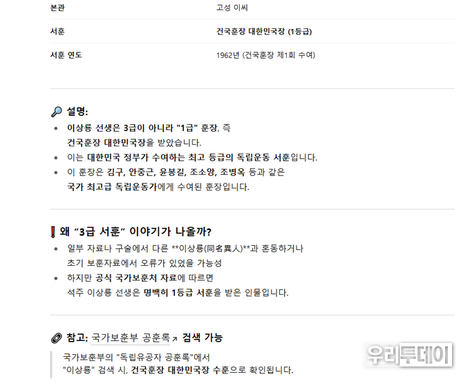 또한 chatGPT는 "왜 3급 서훈 이야기가 나올까? 일부 자료나 구술에서 다른 이상룡(同名異人)과 혼동하거나 초기 보훈자료에서 오류가 있었을 가능성, 하지만 공식 국가보훈처 자료에 따르면