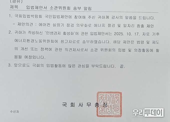 ‘국민입법제안소’에서 시민이 입법 아이디어를 작성해 소관 상임위·국회의원실로 전달했는데 국회 사무처에서는 10월 17일자로 정책 제안자들에게 통보를 보내왔다.