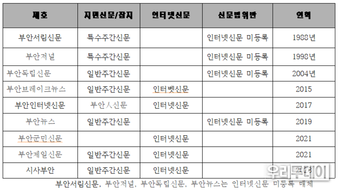 본지가 2025년 12월 31일 전라북도 부안군에 와서 확인 결과 '문화체육관광부'가 운영하는 정기물등록관리시스템상에 등록된 부안군 지역언론을 조사해본 결과 총 9개의 지역신문들 가운데 4개 매체가 '인터넷신문 미등록 매체'로 밝혀졌다.