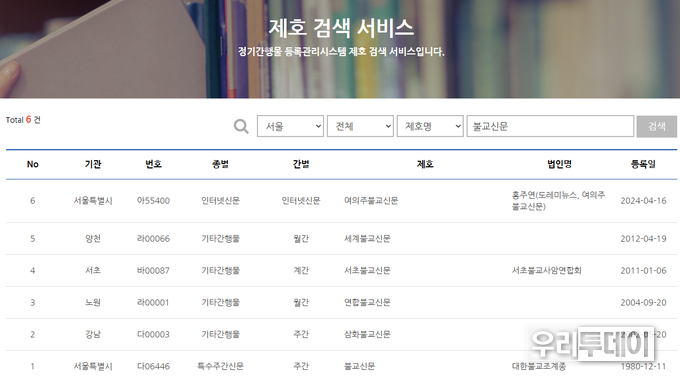 우리투데이 이동현 기자 | 불교계를 대표하는 대한불교조계종이 만드는 신문인 불교신문(발행인 진우스님)이 2026년 4월 18일 현재 문화체육관광부 정기간행물 등록관리시스템에 따르면 '인터넷신문 미등록상태'에서 인터넷상에 홈페이지를 운영하는 것으로 불법으로 드러나 충격을 주고 있다.