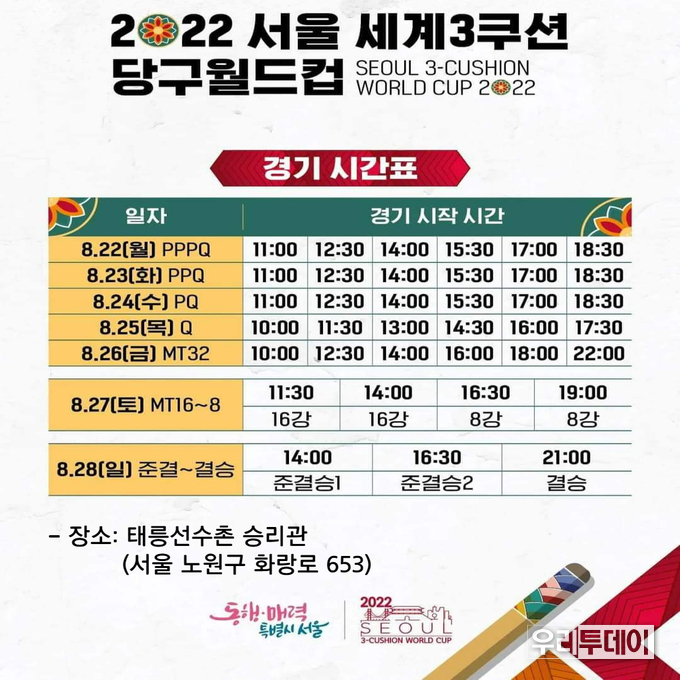 우리투데이 이승일 기자 | 대한민국 심장, 수도 서울에서‘2022 서울 세계3쿠션당구월드컵’(이하 서울월드컵)이 22일 예선1라운드(PPPQ)를 시작으로 일주일간(22일~28일)의 열전에 돌입한다.