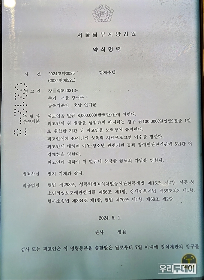 우리투데이 이승일 기자 | 서울남부지방법원이 2024년 5월 1일 약식명령을 통해 벌금 8백만원과 40시간의 성폭력 치료프로그램 이수를 명했음에도 불구하고, 현행 법(法)에서는 피고인에게 아동.청소년 관련기관 등과 장애인 관련기관에는 5년간 취업제한 규정이 있으나 정작 '부동산중개소'에는 법 적용이 안되는 허점이 있어 본지 취재 결과 2025년 8월 13일 기준 아직도 버젓이 '부동산중개업'을 통해 중개업무를 하고 있어 공분을 사고 있다.