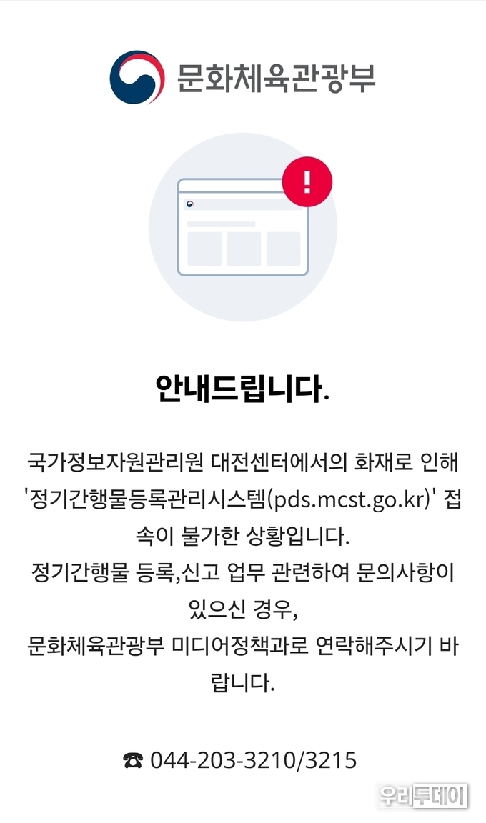 우리투데이 이동현 기자 | 문화체육관광부가 운영중인 '정기간행물 등록관리시스템'이 10월 5일 여전히 먹통상태라 우려의 목소리가 커진다.