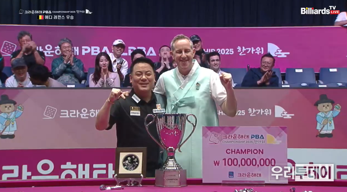 우리투데이 이동현 기자 | 크라운해태 PBA-LPBA 챔피언십 2025 한가위 PBA 결승전이 6일 밤 경기도 고양시 킨텍스 PBA 스타디움에서 벌어졌는데 에디 레펀스(Eddy LEPPENS)가 0 : 2에서 역전해서 우승을 차지하는 기염을 차지했다. 조재호 선수는 아쉽게 준우승에 머물렀다.