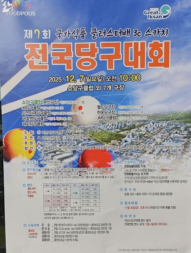 우리투데이 전기원 기자 | 익산시당구연맹이 주최하고, 익산시체육회와 익산시당구연맹이 주관하는 '제7회 국가식품 클러스터배 3C스카치 전국당구대회'가 12월 7일 평동로 740에 위치한 쇼당구클럽을 비롯해 JB당구클럽(선화로 137), 월드당구장(부송로 117), 미스터큐당구클럽(선화로 3길31-12), 천운당구장(선화로 329), 버호벤당구클럽(서동로 98), JM당구클럽(고봉로 32길 8), 해피당구클럽(고현로 90)에서 분산 개최된다.