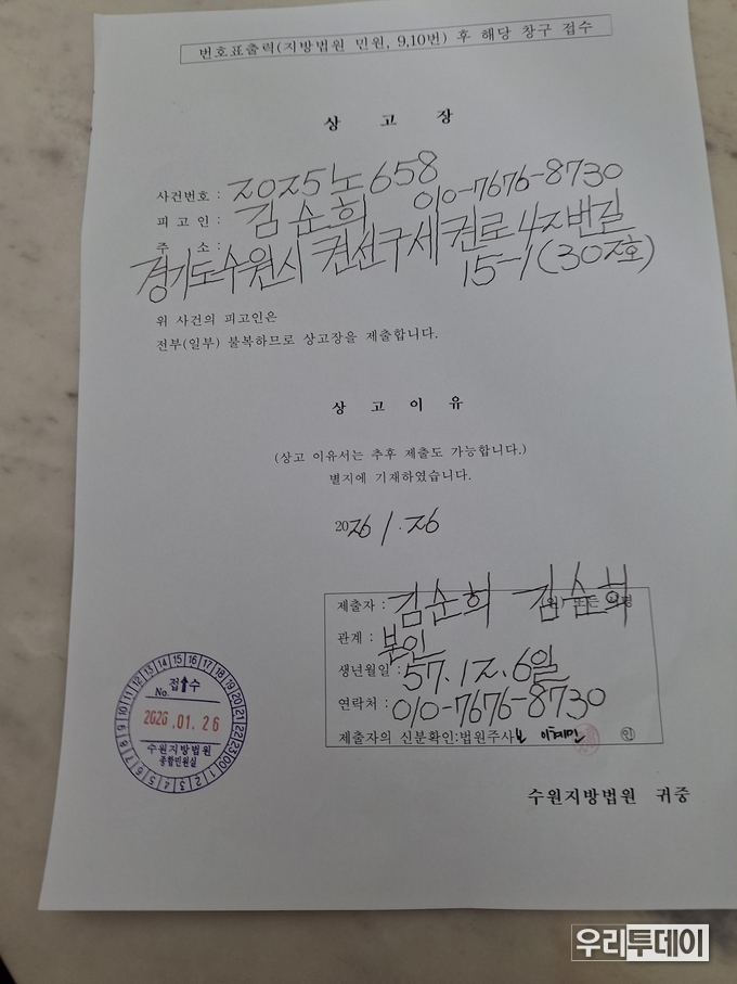 우리투데이 이승일 기자 | 69세 김순희씨는 2026년 1월 26일 항소기각판결에 대해 즉시 상고장을 제출하고 대법원 판결을 받기로 했다.