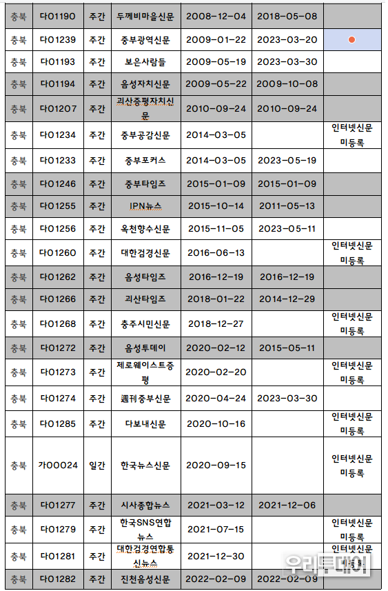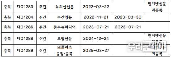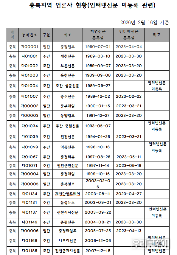 우리투데이 이동현 기자 | 본지는 2026년 2월 16일 인터넷신문 미등록 관련 충북지역 언론사 전수조사를 실시했는데, 충격적인 결과가 나왔다.