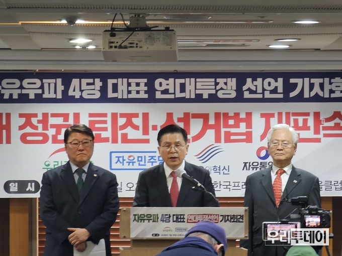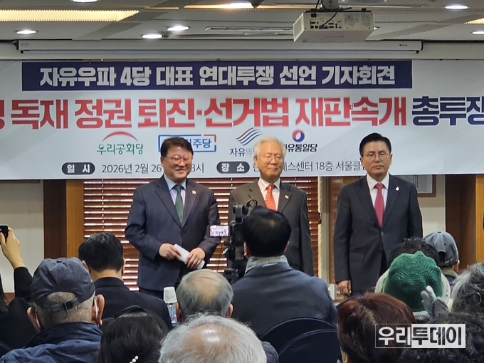 우리투데이 이동현 기자 | 자유우파 4당대표는 2026년 2월 26일 서울 프레스센터 18층 서울클럽홀에서 연대투쟁 선언 기자회견을 통해 이재명 독재정권 퇴진 및 선거법 재판속개를 촉구하는 기자회견을 가졌다.