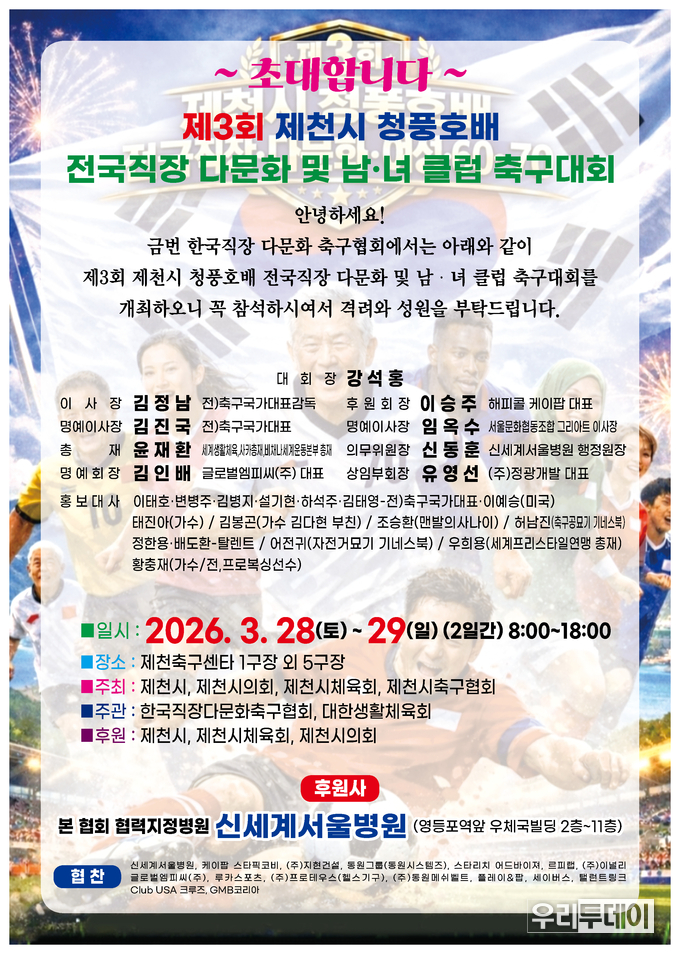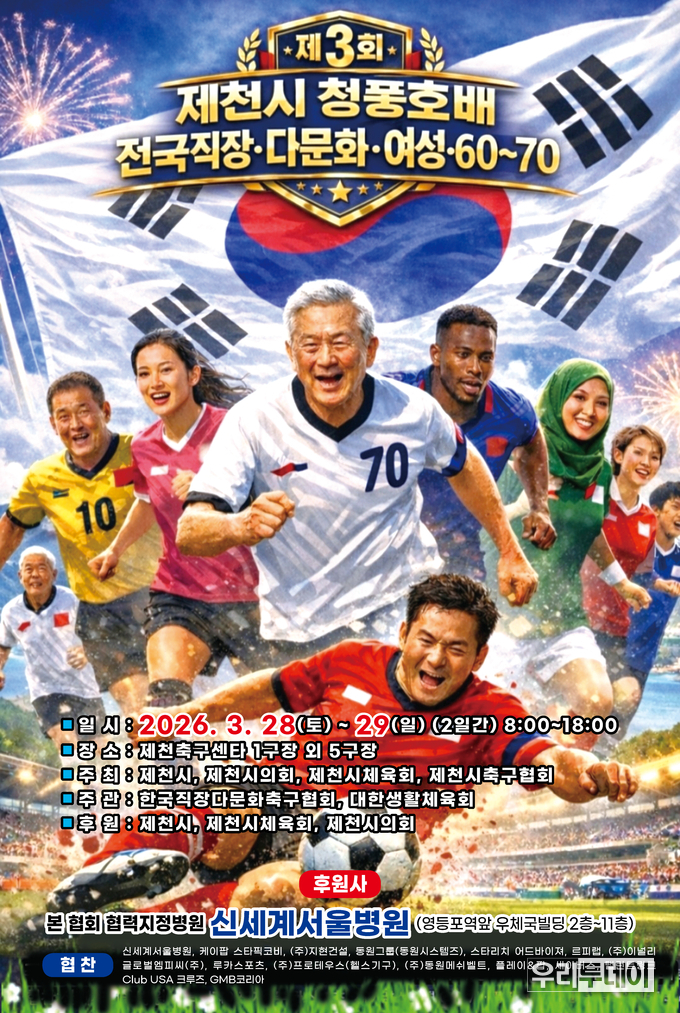 우리투데이 이동현 기자 | 한국직장다문화 축구협회(대회장 강석홍)는 2026년 3월 28일~29일 양일간 제천축구센터 1구장 외 5구장에서 제천시를 비롯해 제천시의회, 제천시체육회, 제천시축구협회가 공동 주최로 한국직장다문화 축구협회와 대한생활체육회가 주관으로 후원사로는 신세계서울병원(한국직장다문화 축구협회 협력지정병원)이 참여하는 '제3회 제천시 청풍호배 전국직장 다문화 및 남.녀 클럽 축구대회'가 개최된다고 밝혔다.